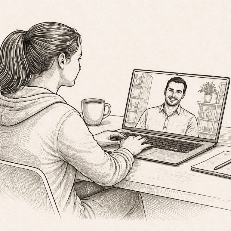 Manche Themen lassen sich leichter ansprechen, wenn der Weg dorthin einfacher ist – ohne Anfahrt, ohne zusätzlichen Aufwand. Wir verabreden uns zu einem festen Termin und sprechen per Video. Sie können von zu Hause oder einem anderen vertrauten Ort aus teilnehmen.